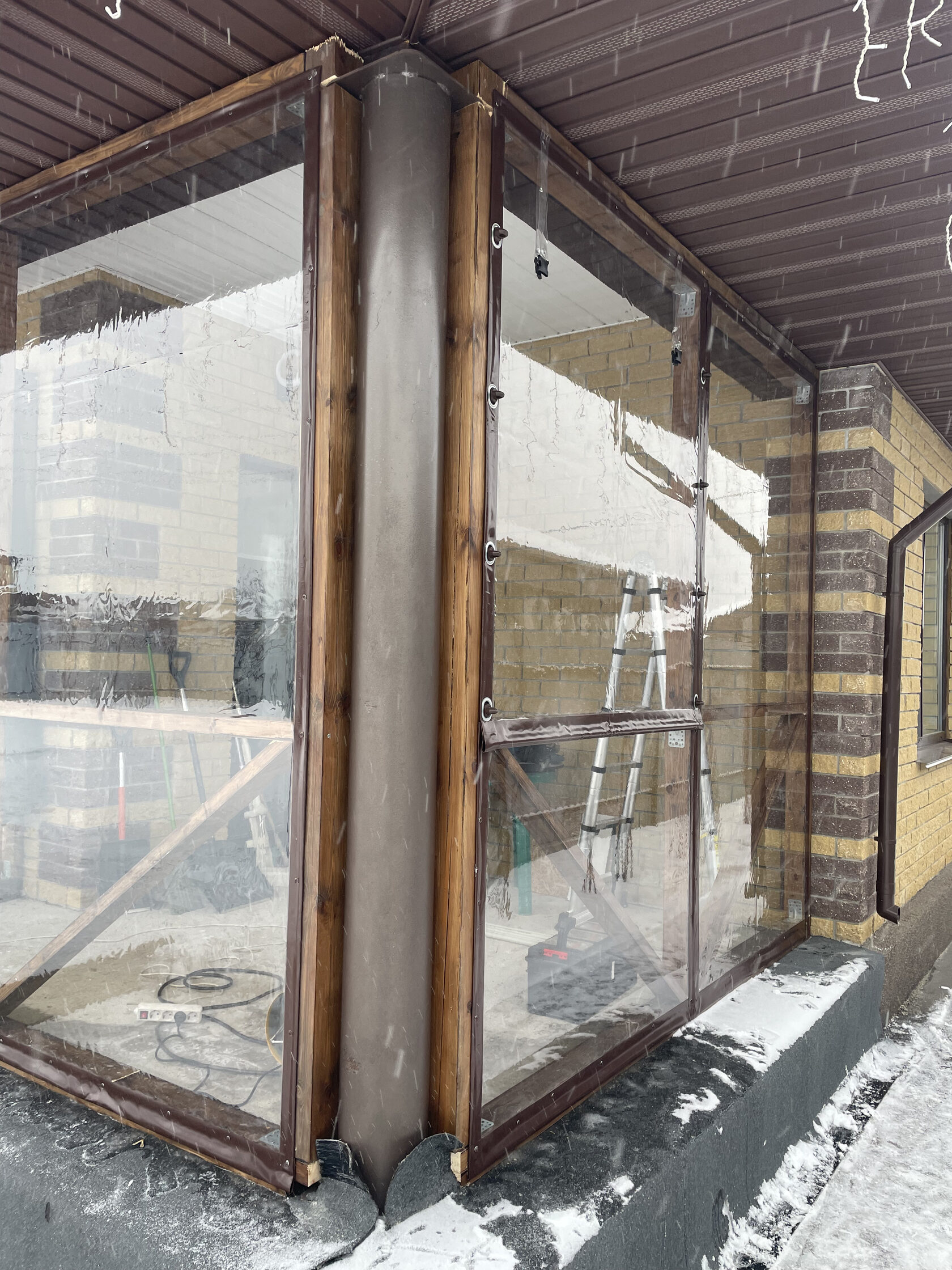 Что представляет из себя конструкция: дверь на двусторонней молнии и мягкое окно на пластиковой поворотной скобе. Верхняя часть окна (изделия) крепится на цветные саморезы через шайбу, по бокам окна смонтированы люверсы, на столбах устанавливается пластиковая поворотная скоба. В нижней части изделия делаем карман под утяжелитель(для выравнивания и удобства скручивания). В верхней части устанавливаем ремни для фиксации.
