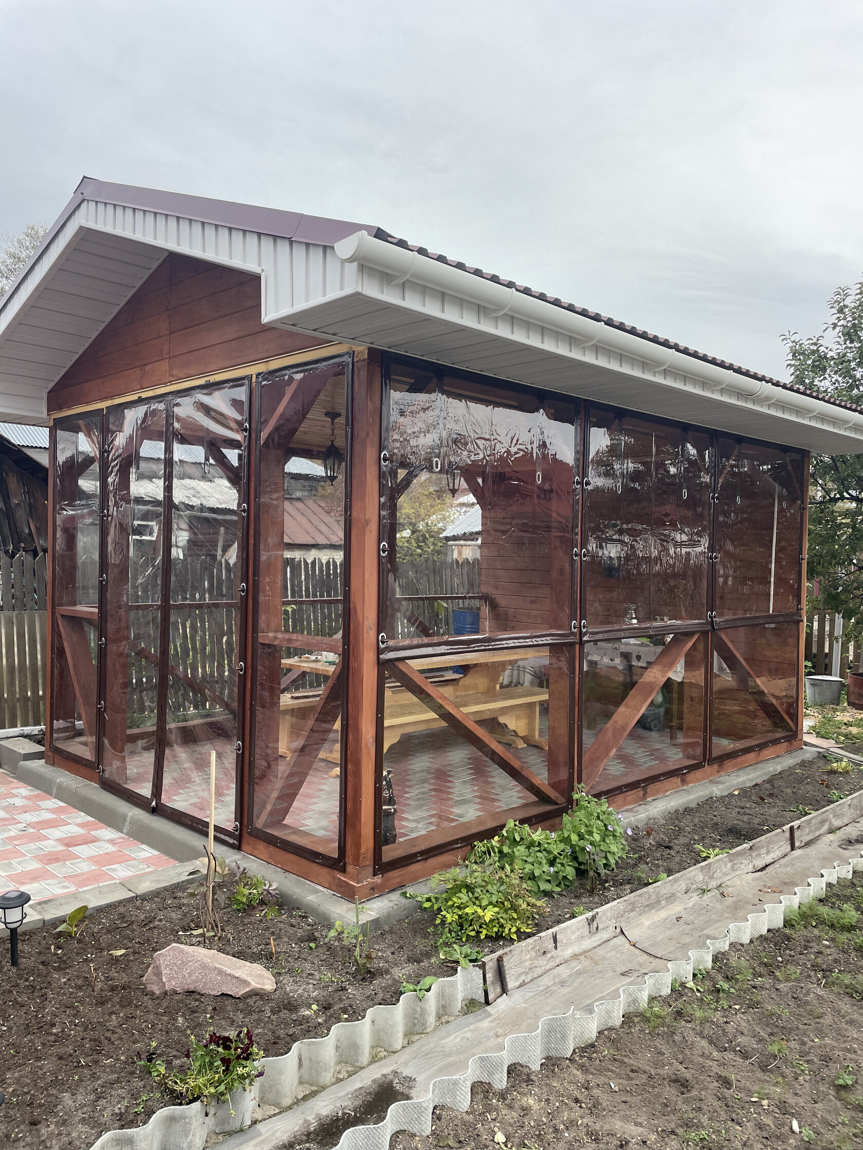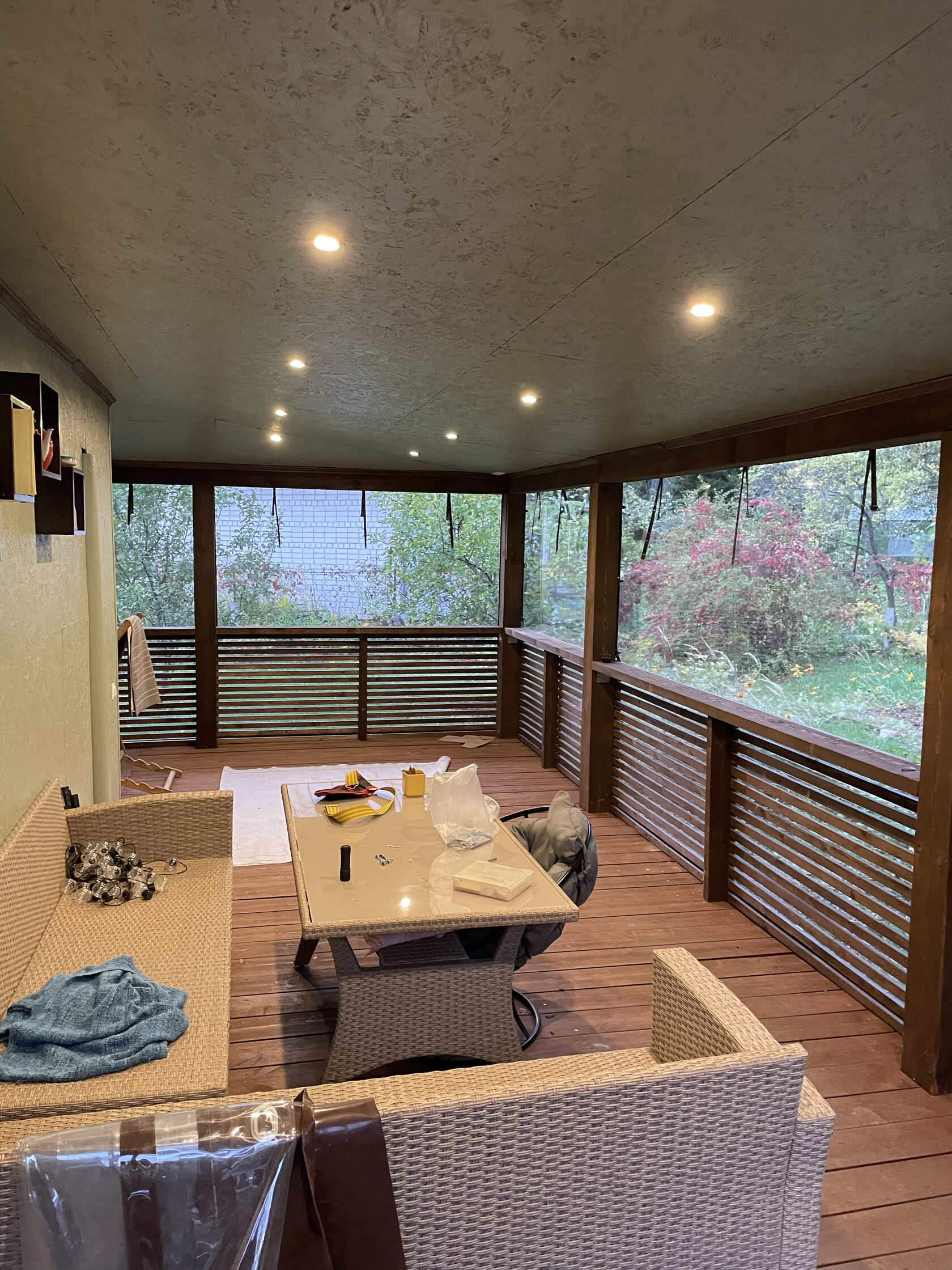 Панорамные окна позволят закрыть большую веранду и наслаждаться видом в любую погоду.